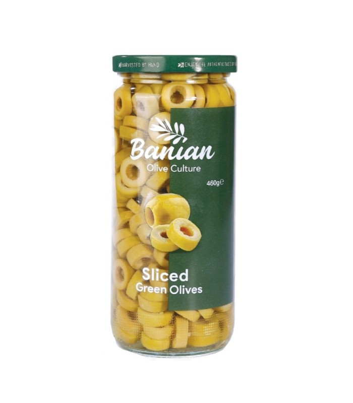 زیتون اسلایس بانیان، که به صورت برش خورده است.یک محصول غذایی است که از زیتون سبز تازه و خوش طعم تهیه شده است.