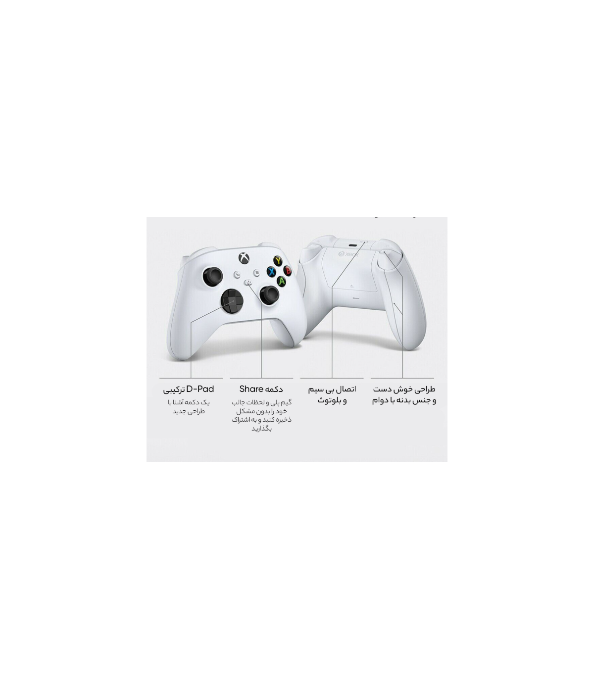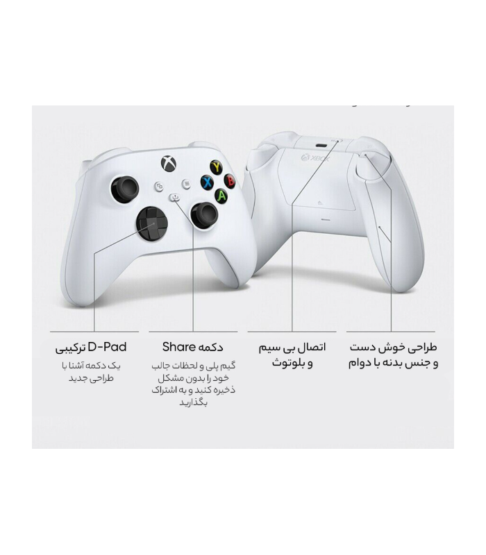 این کنترلر جثه و ابعاد نسبتا کوچکتری نسبت به کنترلر ایکس باکس وان دارد و دکمه D-Pad آن نیز تغییر کرده است.این دکمه اکنون مشابه دکمه D-Pad کنترلر الیت ایکس باکس است و فضای خالی بین چهار جهت اصلی با دکمههای پیوسته پر شده است تا کار کردن با آن راحتتر شود. همچنین، دکمههای ماشهای این کنترلر دارای بافتی نسبتا زبر هستند که باعث کاهش تعرق و کنترل بیشتر و انتقال لرزش بهتر میشود. دکمههای ماشهای نیز بهبود یافتهاند و فشار دادن آنها بهتر احساس میشود.نکته قابل توجه در این کنترلر، اضافه شدن دکمه Share در وسط کنترلر است که نبود آن در کنترلر ایکس باکس وان به شدت احساس میشد. با اضافه شدن این دکمه، دیگر لازم نیست برای به اشتراک گذاشتن محتوای خود از بازیها، وارد یک اپلیکیشن جدا شوید و خیلی سریع میتوانید اسکرینشاتها و کلیپهای خود را به اشتراک بگذارید.کنترلر جدید ایکس باکس دارای قابلیتی به نام محاسبه تأخیر پویا است که به بازیسازان این امکان را میدهد تا قابلیتهای تعاملی بازیهای خود را بهبود ببخشند. با این ویژگی، هماهنگی بین فشار دکمهها روی کنترلر و اتفاقات درون بازی، به لطف اتصال بیسیم 2.4 گیگاهرتزی کنترلر به کنسول، بهبود پیدا میکند.کنترلر جدید ایکس باکس با کنسولهای ایکس باکس وان کاملا سازگار است و عملکرد آن در ایکس باکس وان و ایکس باکس سری ایکس|اس هیچ تفاوتی نخواهد داشت. این کنترلر با ویندوز 10 نیز سازگاری کامل دارد.