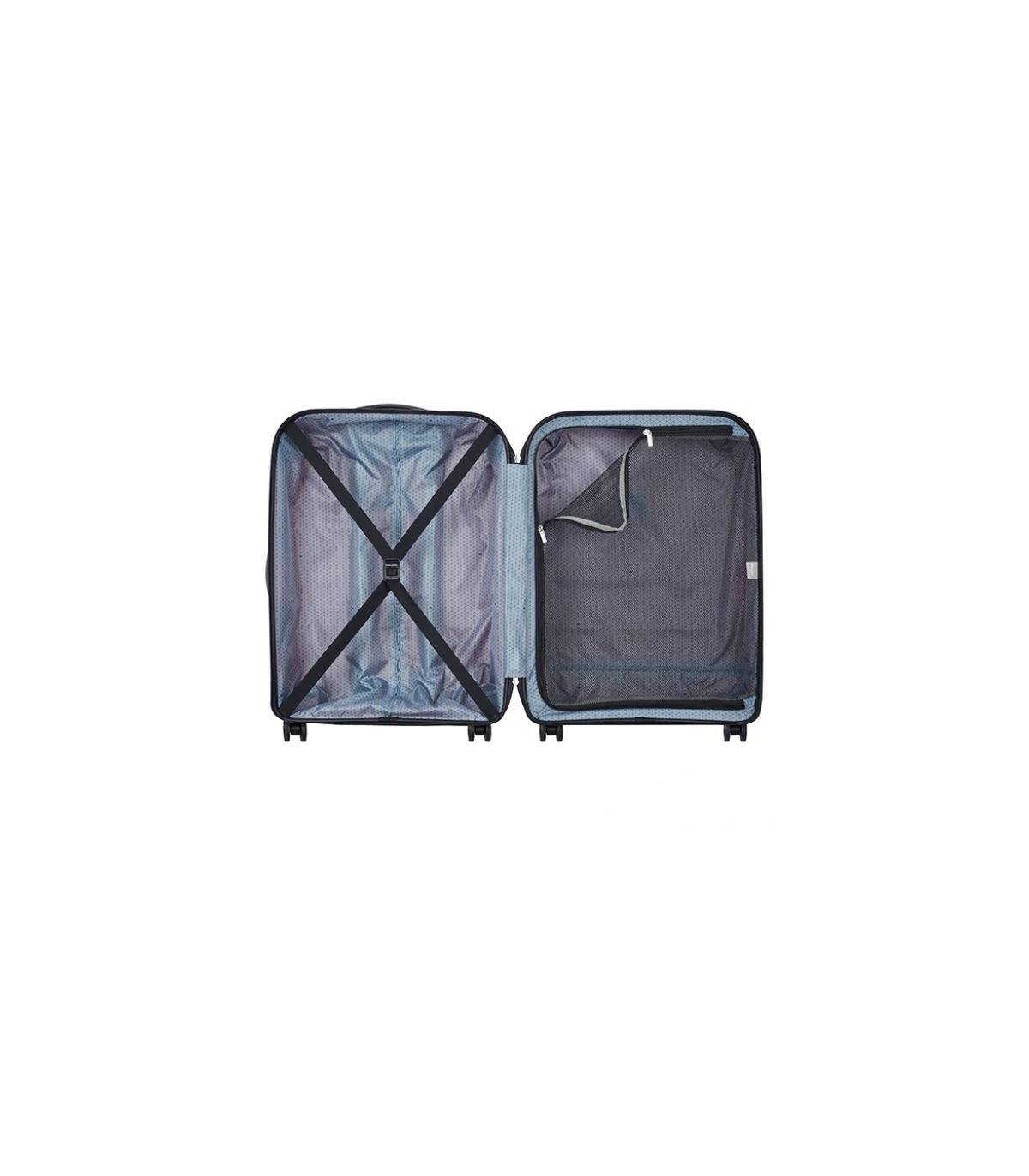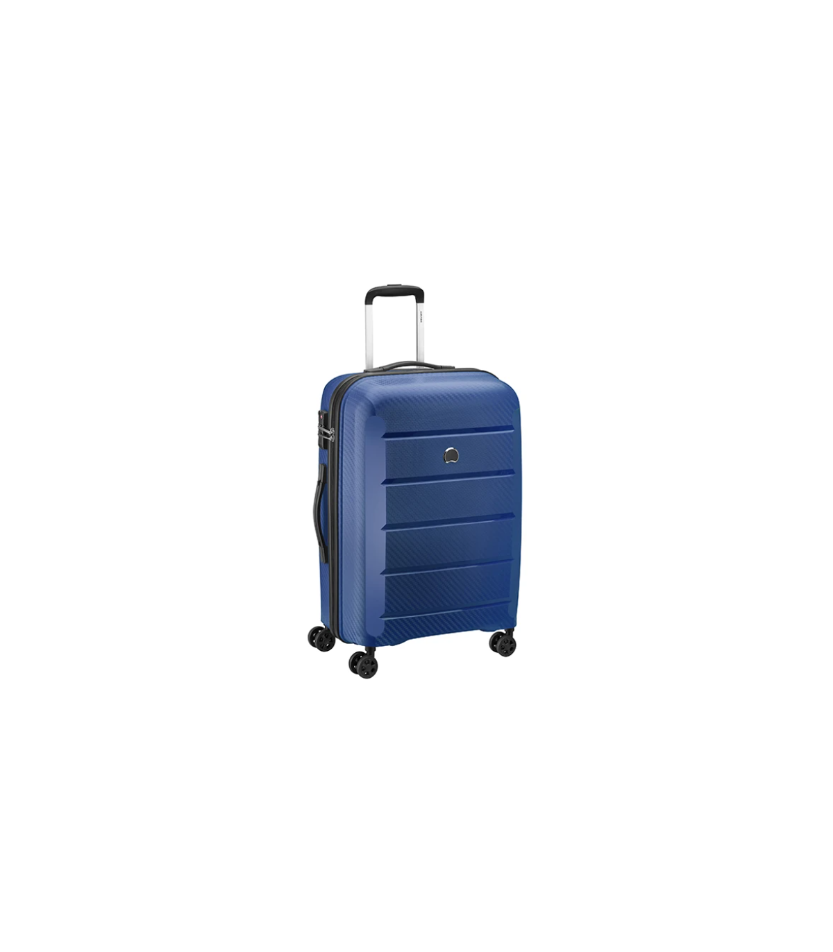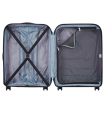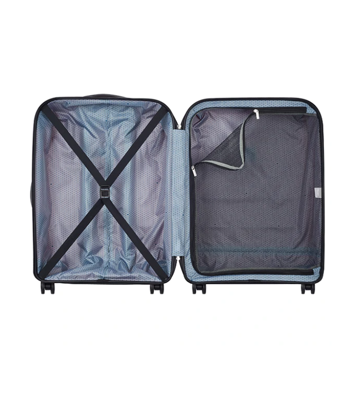 چمدان برند دلسی سایز متوسط از جنس پلی‌پروپیلن، دارای پوشش ضدآب و ضدآلودگی، بسته شدن به صورت زیپ با قفل سری TSA، دارای ساختار سخت، مدل بینالانگ