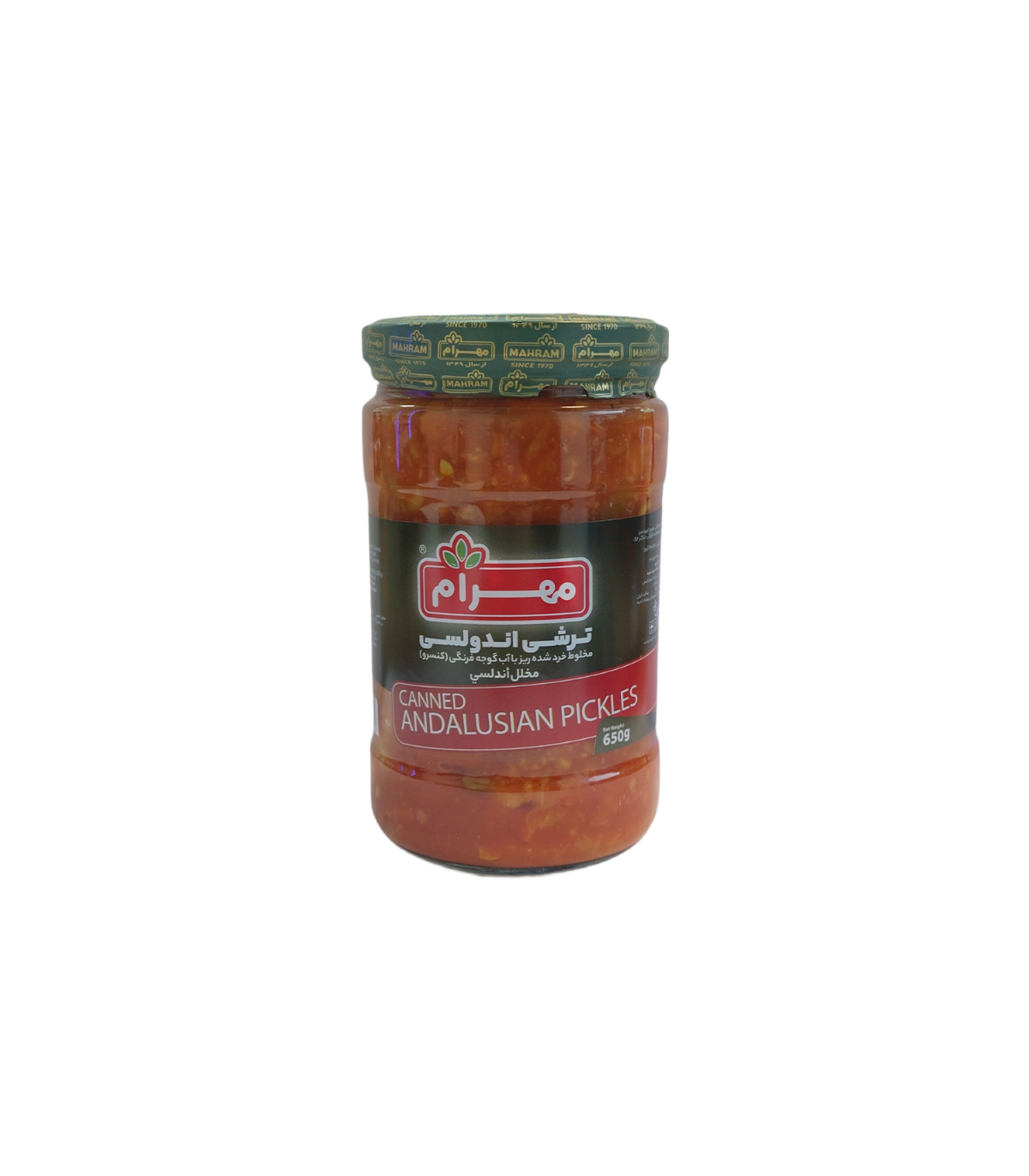 ترشی اندولسی مهرام طعمی اصیل وخوشمزه در یک شیشه 650 گرم