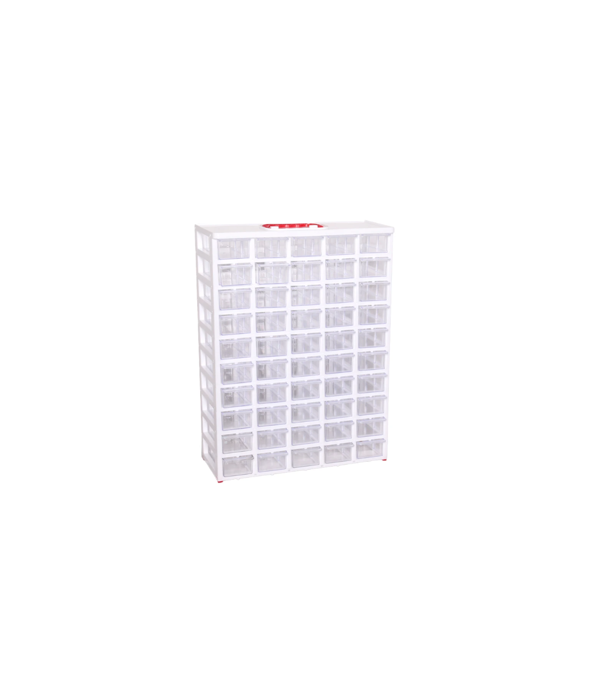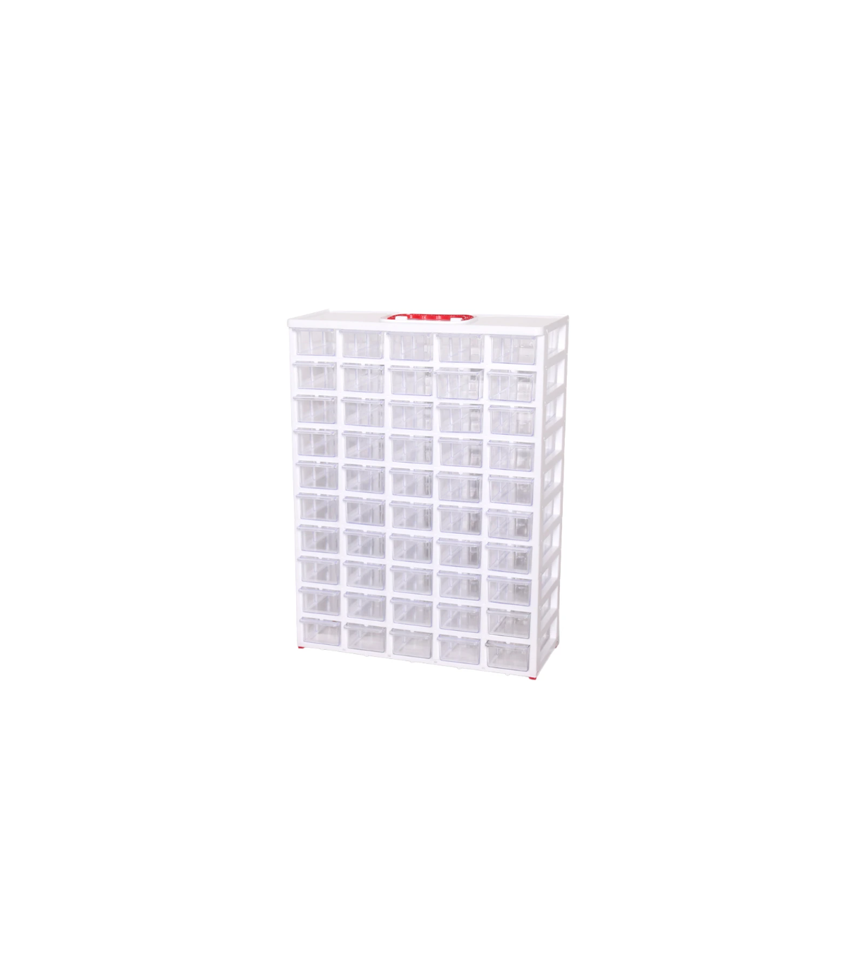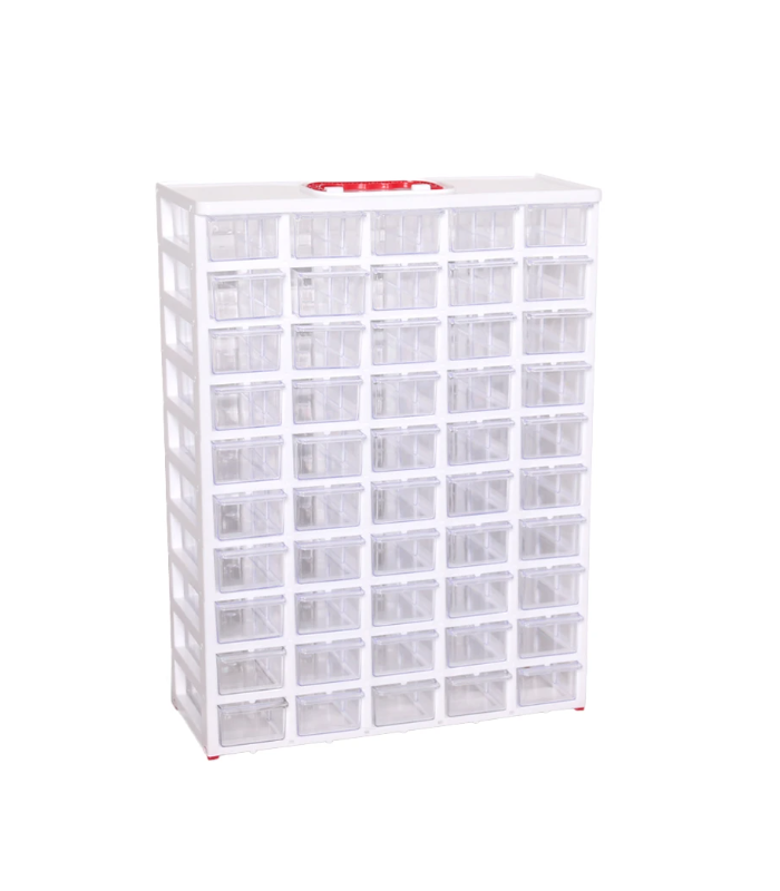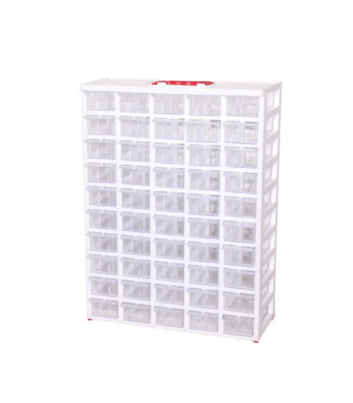 فایل کشویی کریستالی (یا ارگانایزر) 50 کشو صادراتی 10 طبقه مناسب نگهداری لوازم در فروشگاه ها، دفاتر اداری، آزمایشگاهها و انبارها، کارگاه، دفتر، تعمیرگاه و یا حتی منازل کاربرد دارد. این محصول در هر یک از طبقات 5 کشو شفاف دارد و همچنین امکان حمل با دستگیره های محکم آن میسر است و با وجود کشوهای شفاف میتوانید به راحتی اجناس داخل آن را دیده و به جنس مورد نظر خود به سادگی دسترسی پیدا کنید. از دیگر ویژگی های این محصول با کیفیت و مقاوم مقسم های درون کشو آن است که میتوانید با شیارهای موجود و مقسم ها هر کشو را به 3 کشو تقسیم نموده و فضای کاستوم و مورد دلخواه خود را خلق نمایید. از این محصول برای نگهداری و تفکیک قطعاتی از قبیل میخ، پیچ، کلید، دکمه، سوزن و هزاران قطعه کوچک دیگراستفاده می شود. با استفاده از این محصول مشکل بی نظمی و گم شدن قطعات حین کار برطرف شده و موجب ایجاد نظم و ترتیب به دلخواه شما می شود.