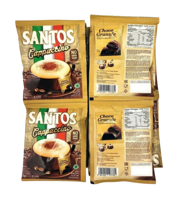 کاپوچینو ساشه‌ای سانتوس یک نوشیدنی خوش‌طعم و کرمی است که به‌راحتی و تنها با آب جوش آماده می‌شود. مناسب برای دوستداران قهوه فوری با کف غلیظ و عطری دلپذیر.