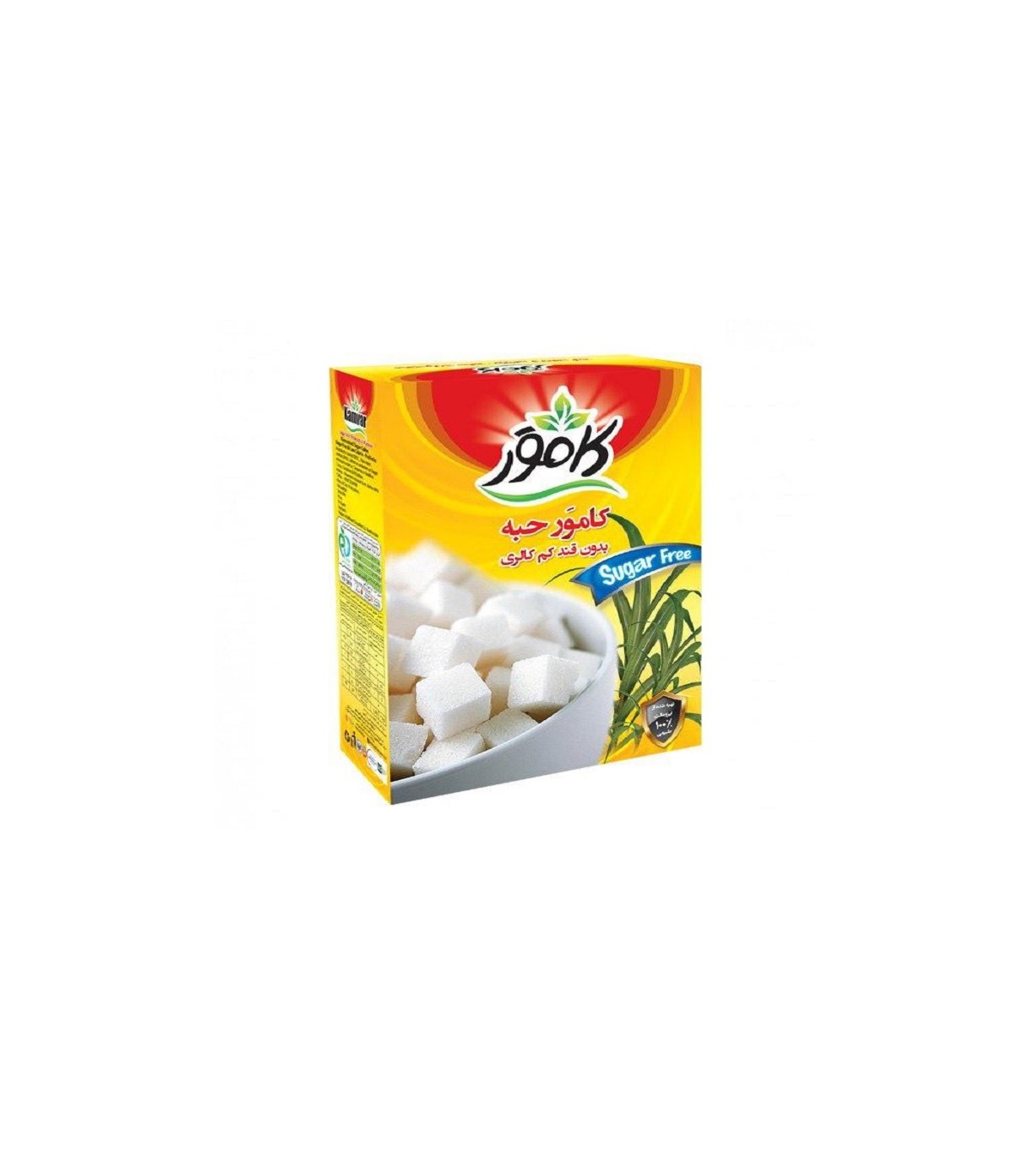 قند رژیمی و بدون قند کامور 250 گرم حاوی ایزومالت می باشد.میزان کالری ایزومالت نصف شکر است که باعث کنترل چاقی میشود.
