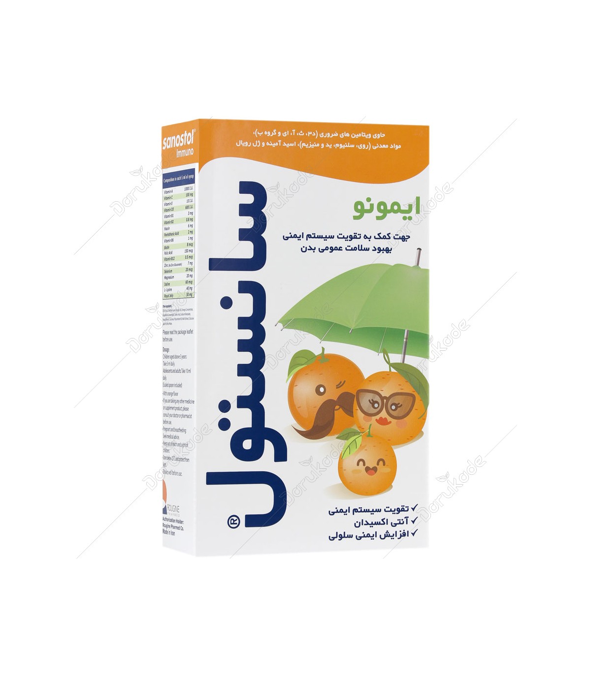 - شربت سانستول ایمونو دارای اثرات آنتیاکسیدانی با داشتن رویالژلی و ویتامینهای A، E، C و مواد معدنی روی و سلنیوم