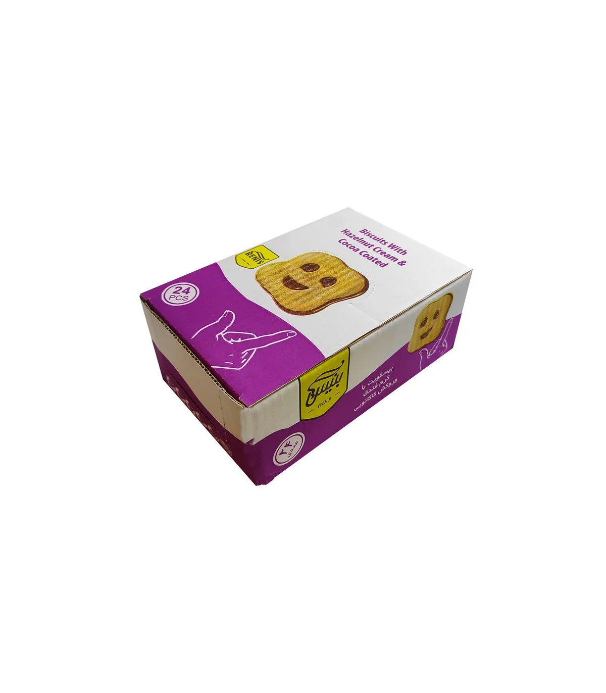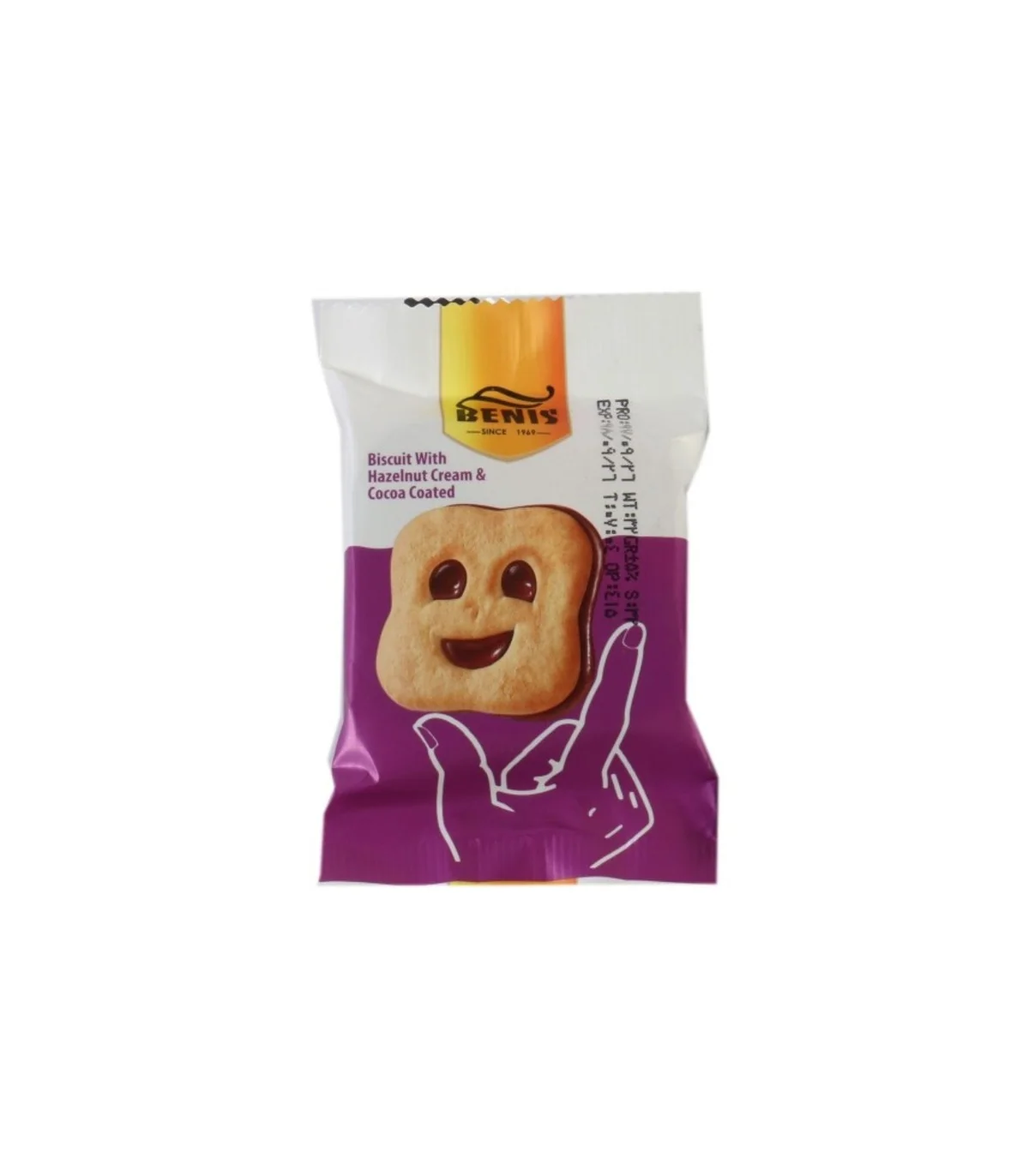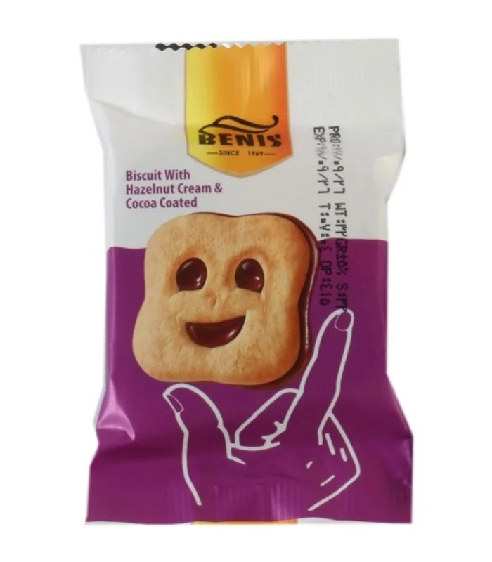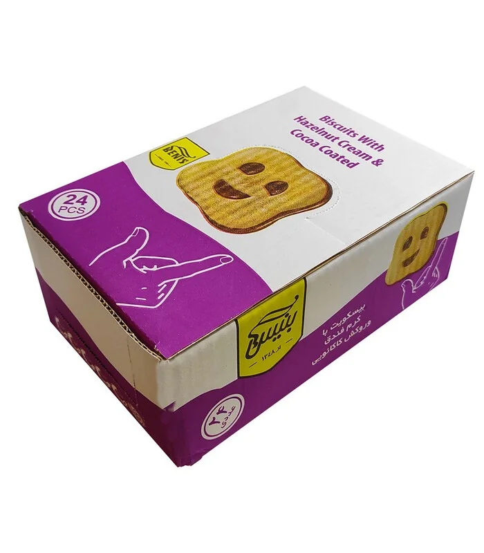 بیسکویت بنیس با خامه فندق و نارگیل تست شده - با طعمی بینظیر و طرح لبخند جذاب، ایدهآل برای میانوعده و پذیرایی. خرید آنلاین با کیفیت تضمینی.