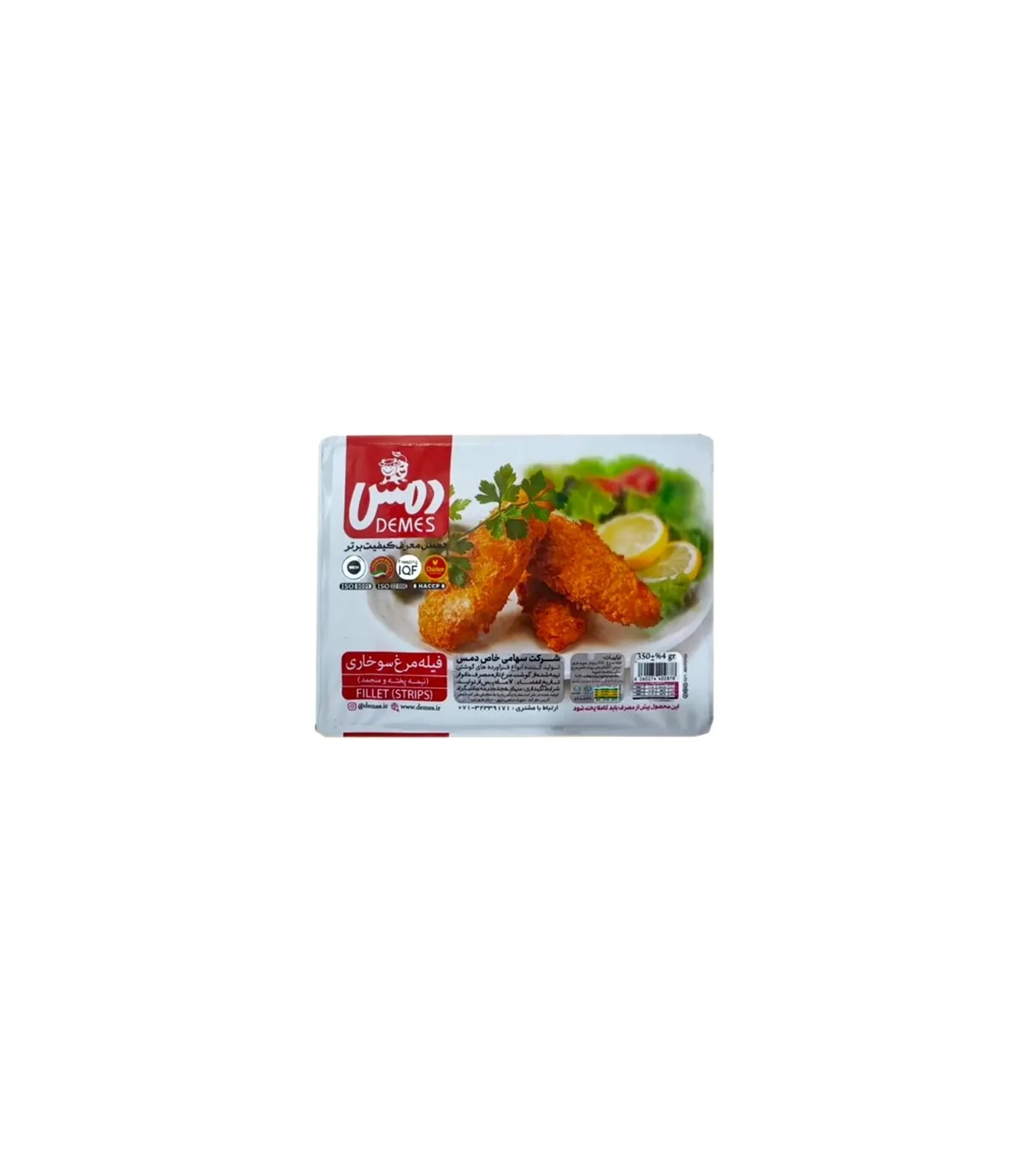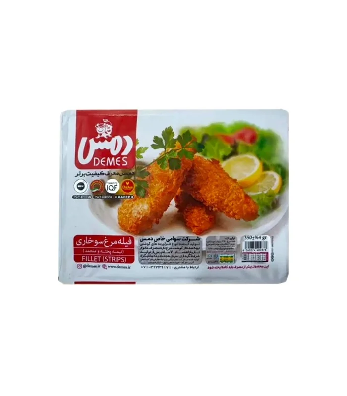 فیله مرغ سوخاری منجمد دمس تهیه‌ شده از فیله مرغ تازه و باکیفیت است که با پودر سوخاری ترد و خوش‌ طعم پوشانده شده و به‌ صورت کاملاً بهداشتی منجمد شده است.