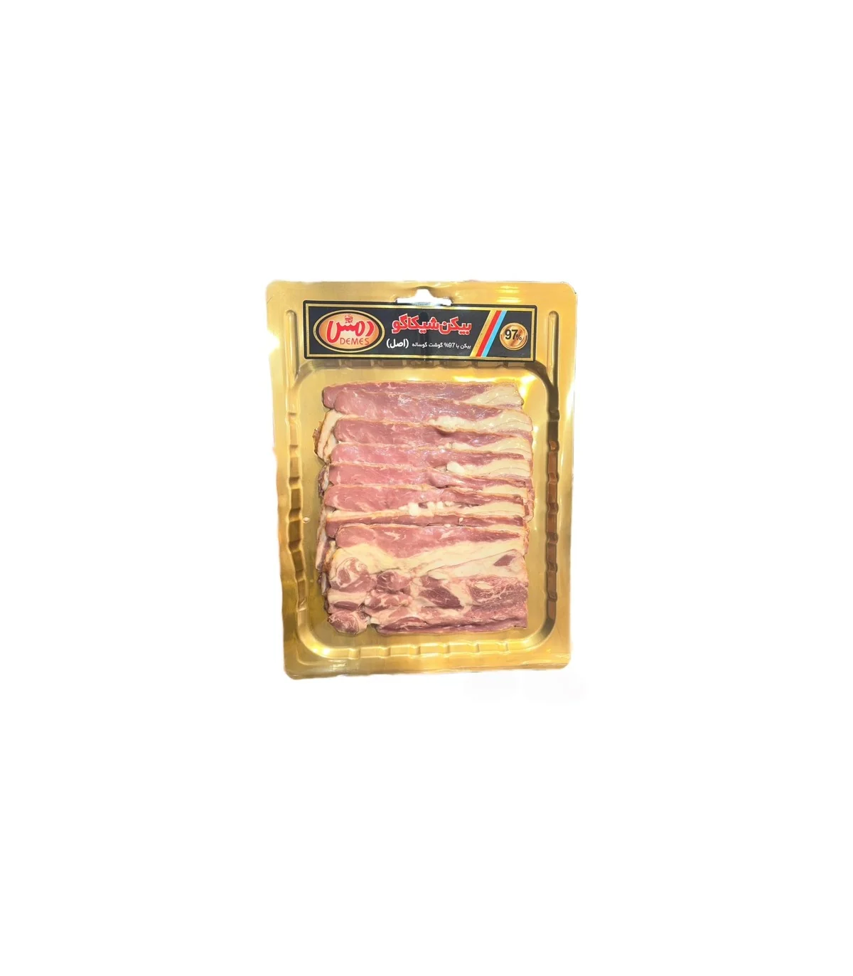 بیکن شیکاگو دمس تهیه شده از 97 درصد گوشت گوساله خالص، محصولی باکیفیت از برند دمس است که با الهام از سبک شیکاگویی و ادویه گذاری متعادل، طعمی غنی و خوشخوراک ارائه میدهد.این بیکن بافتی لطیف و در عین حال برشته پذیر دارد و برای استفاده در صبحانه، برگرها، ساندویچها، پیتزا و انواع غذاهای فست فودی بسیار مناسب است.