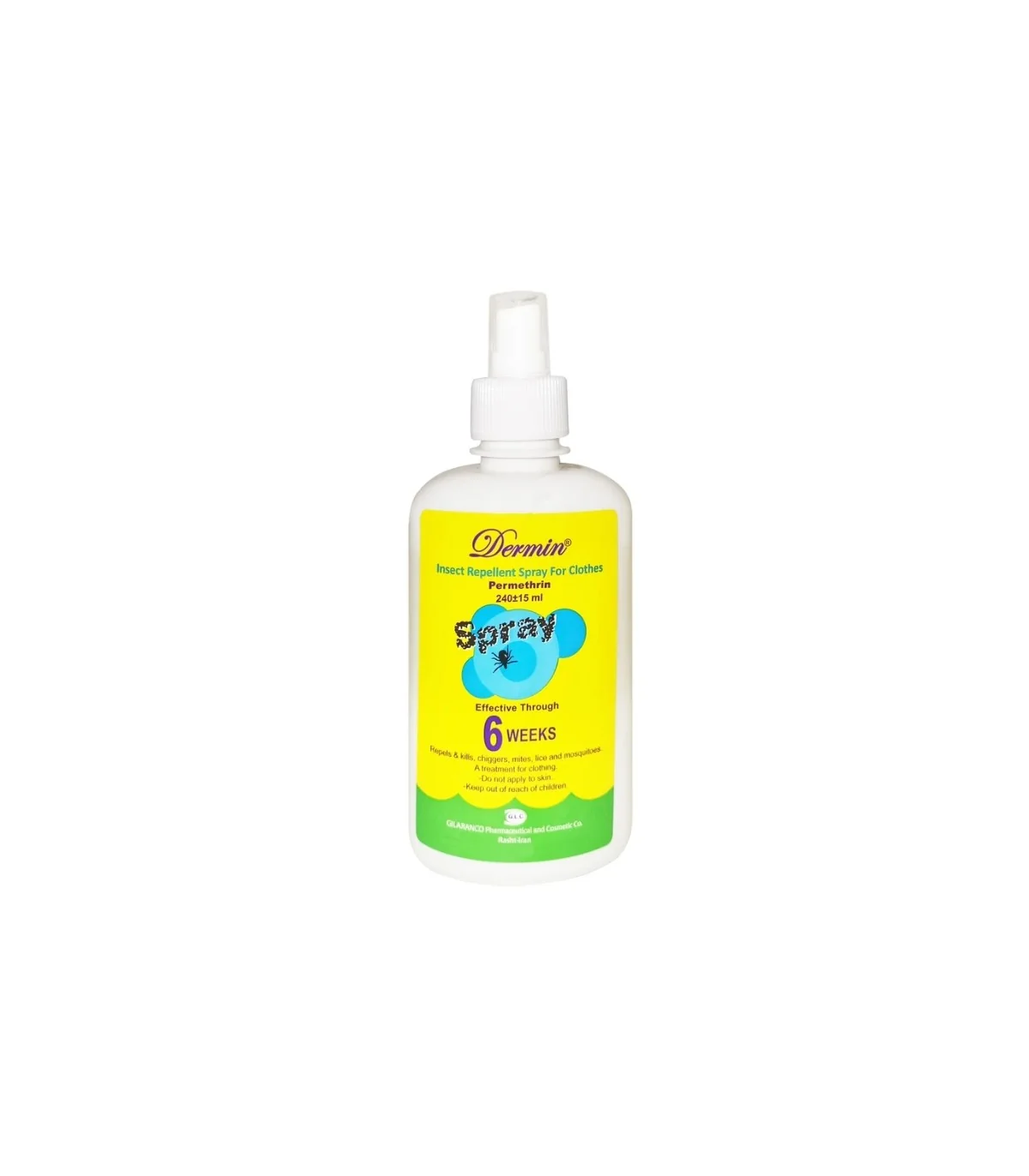 اسپری دورکننده حشرات لباس، حاوی پرمترین، مؤثر در دفع شپش، پشه، ساس و کنه. ماندگاری محافظت تا 6 هفته یا 6 بار شستشو بر روی انواع پارچه. نحوه مصرف نیازمند اسپری در فضای باز تا حد رطوبت و خشک شدن کامل قبل از استفاده است.