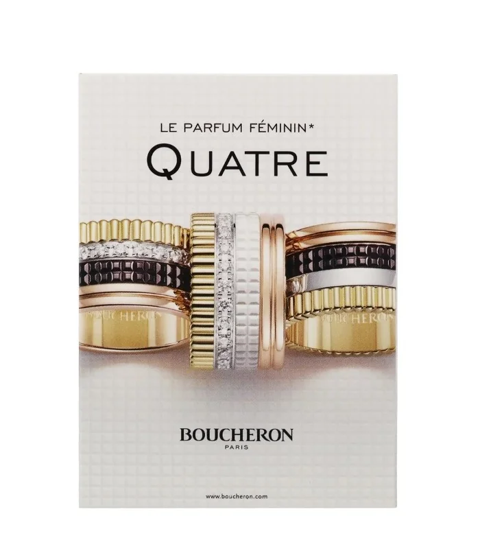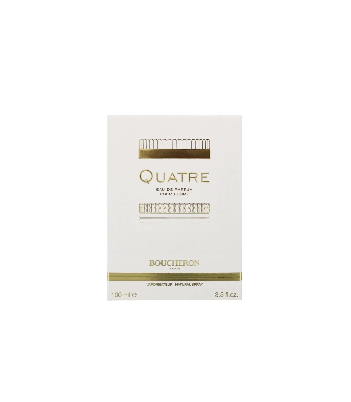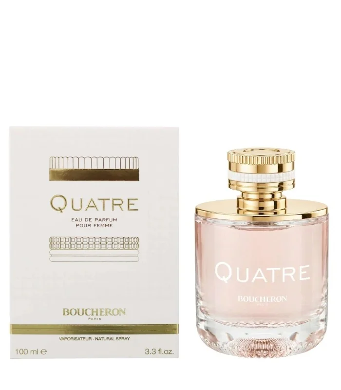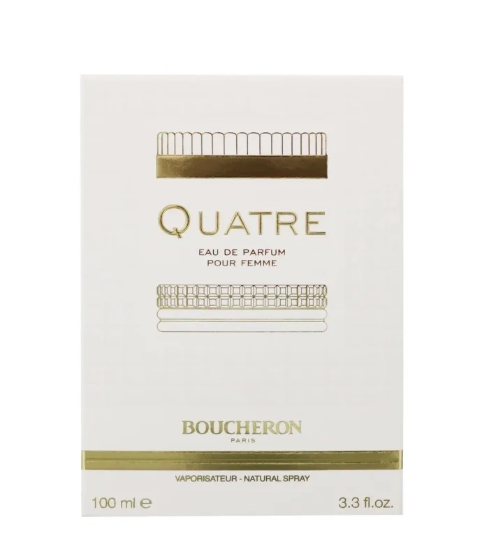 در تولید ادو پرفیوم زنانه بوچرون مدل Quatre حجم 100 میلی لیتر از بهترین اسانسهای طبیعی و سنتزی تحت استانداردهای جهانی استفاده شده است. شیشه بطری از کریستال شفاف و مرغوب ساخته شده که به خوبی محتویات صورتی کمرنگ داخل خود را به نمایش میگذارد. متریال به کار رفته در بخش طلایی و سفید درپوش نیز از پلاستیک فشرده و فلز با آبکاری باکیفیت است که در طول زمان تغییر رنگ نمیدهد و درخشش خود را حفظ میکند.